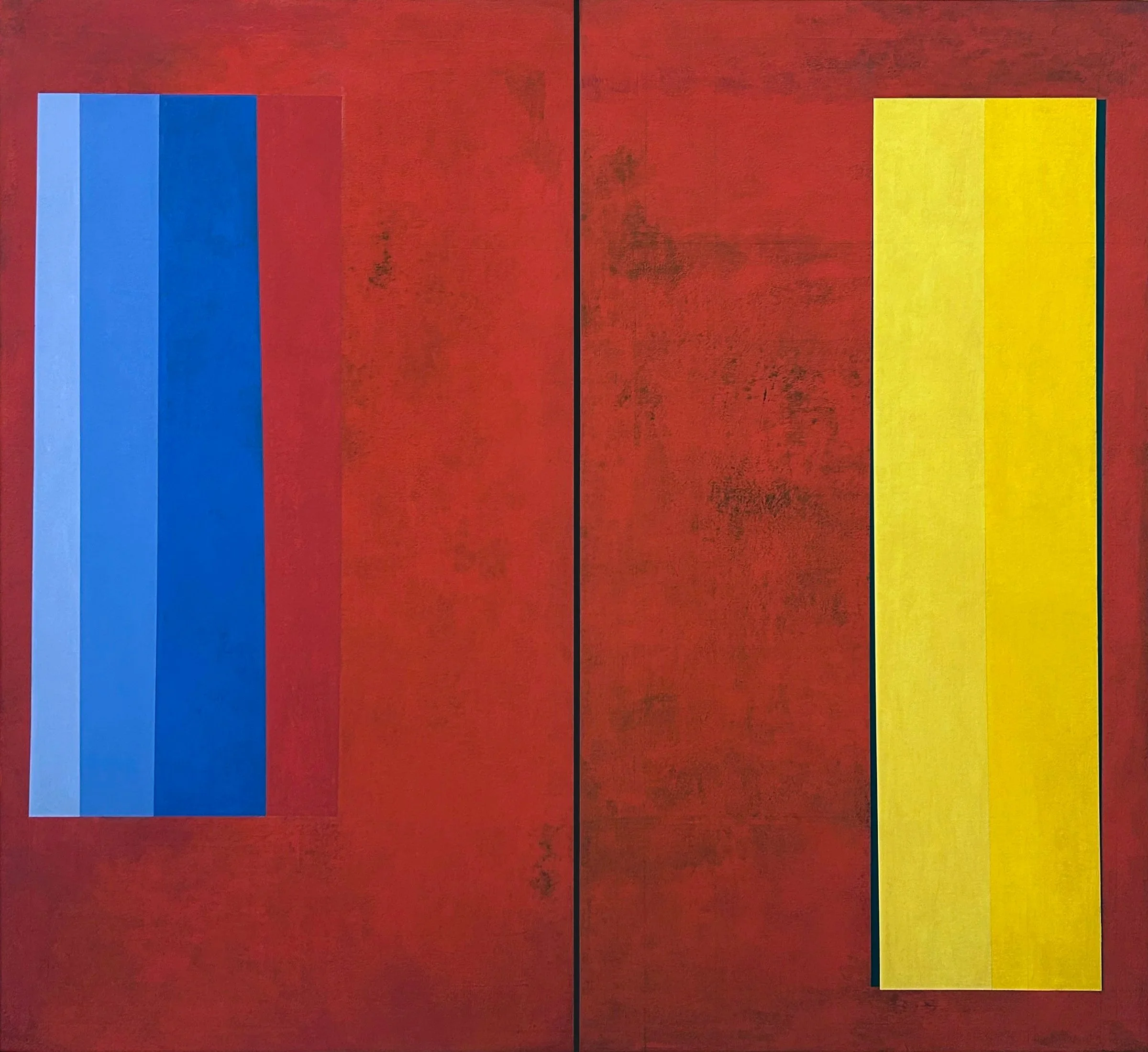 Red, Yellow, Blue: Tension Between Two Points ・Flashe on canvas mounted on panel ・diptych ・44" x 48" ・ 2025